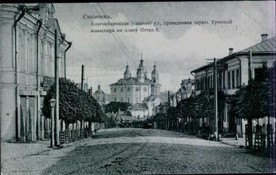 Keywords: Blagoveshchenskaya street, Smolensk 5.jpg en Blagoveshchenskaya Street in Smolensk on the left - the current House of Books in the background - Trinity Monastery and Cathedral of the Assumption ru Благовещенская улица в Смоленске слева - нынешний Дом Книги на заднем плане - Т оицкий монасты ь и Успенский собо О игинальная отк ытка е установлены before 1917 года PD-RusEmpire 20th-century postcards of Russia Postcards of Smolensk |