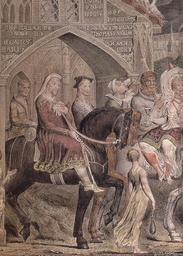 Keywords: Blake-Cant-pilgrims-detail-b.jpg en Blake-Cant-pilgrims-detail-b Chaucer Coloured engraving 2nd state 1810 Chaucer's Canterbury Pilgrims Copper engraving with additions in watercolor by the artist Signature and imprint Painted in Fresco by William Blake by him Engraved Published October 8 1810 at No 28 Corner of Broad Street Golden Square; inscribed below Chaucers Canterbury Pilgrims and with the names of the pilgrims Reeve Chaucer Clerk of Oxenford Cook Miller Wife of Bath Merchant Parson Man of Law Plowman Physician Franklin 2 Citizens Shipman The Host Sompnour Manciple Pardoner Monk Friar a Citizen Lady Abbess Nun 3 Priests Squires Yeoman Knight Squire The engraving is known in five states Blake's use of line engraving emulating the styles of early printmakers Albrecht Dürer and Lucas van Leyden evokes the character of Chaucer's poetry Blake painted the pilgrims after a quarrel with R H Cromek and Thomas Stothard regarding whether the commission had originally been Blake's The painting was exhibited at his brother's Soho shop in 1809 and this engraving was created from it 2013-05-17 19 07 38 scanned from a book Creator William Blake PD-old-100 Uploaded with UploadWizard William Blake's Chaucer |