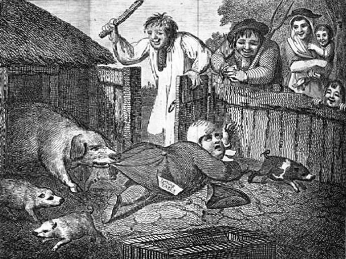 Keywords: Blake for The Wit's Magazine - 1784 bw.jpg and comment from M Dorothy George 'Catalogue of Political and Personal Satires in the British Museum' VI 1938 The parson dissatisfied at the young pig offered by 'Hodge' has entered the sty in order to choose the best of the litter One of many satires on tithes cf BMSat 6209 c Supplementary information This print illustrates verses that are printed in letterpress in the text of The Wit's Magazine pp 71-72 For William Blake's prints for The Wit's Magazine etched after designs by Thomas Stothard and Samuel Collings see 1872 1109 322-26 and J 7 6 Another impression of this print is in a scrapbook in the British Museum collection reg no 1979 1110 25 not yet catalogued on Merlin as of 12th July 2004 More BibliographyBM Satires 6737 bibliographic detailsEssick 1991 XVI 2 bibliographic details en Уильям Блейк Десятина нату ой или свиная месть г авю а по исунку Сэмюэла Коллингса для The Wit's Magazine Жу нала ост оумцев 1784 2014-07-10 09 35 29 w Morgan Library and Museum http //www themorgan org/collections/works/blake/work asp id onDisplay page 73 Creator William Blake PD-old-100 Uploaded with UploadWizard William Blake's engravings after Samuel Collings |