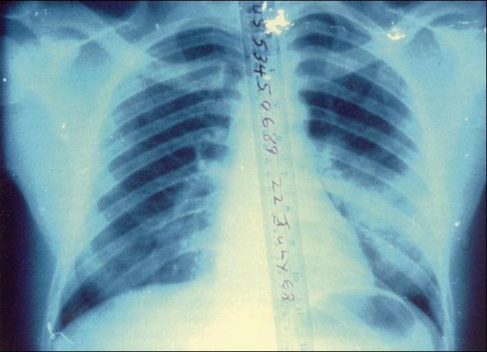 | Keywords: Blast lung-chest radiograph.jpg en Blast lung This chest roentgenogram of a soldier who was injured by blast shows bilateral infiltrates from pulmonary contusion The patient survived without sequelae ~ U S Army Wound Data and Munitions Effectiveness Team WDMET The WDMET database was comprised from the cases of 7 989 wounded American soldiers in Vietnam from 1967 through 1969 22 July 1968 2013-04-29 14 19 35 From the Textbook of Military Medicine part I volume 5 page 302 figure 9-2 http //webapp1 dlib indiana edu/cgi-bin/virtcdlib/index cgi/4931363/FID1/DATA/operationalmed/Military 20Medicine/Blast 20Injuries/Blast 20Injuries- 20Recognition 20and 20Management htm United States Army Medical Department PD-USGov Uploaded with UploadWizard Blast injuries Lungs |