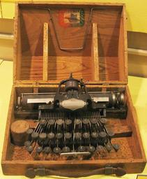 Keywords: Blickensderfer typewriter 2.jpg Antique Blickensderfer typewriter invented by George C Blickensderfer 1850-1917 in 1891 and manufactured by the Blickensderfer Typewriter Co Stamford Connecticut USA This model is the Blickensderfer 5 the first commercial model manufactured beginning 1893-5 until after 1906 The typefaces were on a cylindrical typewheel seen at top which could be changed to type different fonts One of the first truly portable typewriters it had a DHIATENSOR type keyboard instead of the more common QWERTY For more information see http //www typewritermuseum org/collection/index php3 machine blick5 cat ks Blickensderfer 5 The Virtual Typewriter Museum Alteration brightened source image so details of machine can be seen Image Blickensderfer typewriter jpg 2005-12-22 Picture taken by Ian Ruotsala Released by Ian Ruotsala to public domain Image Blickensderfer typewriter jpg Ian Ruotsala Blickensderfer Typewriter Co Blickensderfer typewriters |