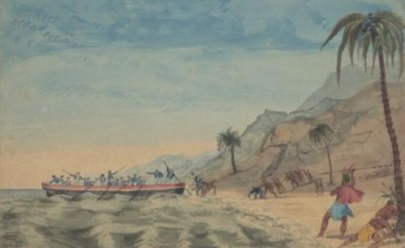 Keywords: Bligh open boat.jpg en The attempt by Capt Bligh of the Bounty who with 18 sailors had been set adrift in an open boat on April 28th 1789 to land on Tofoa http //findingnz co nz/al/gal1_bounty htm Robert Cleveley 1747-1809 18th or 19th century PD-old Mutiny on the Bounty Robert Cleveley |