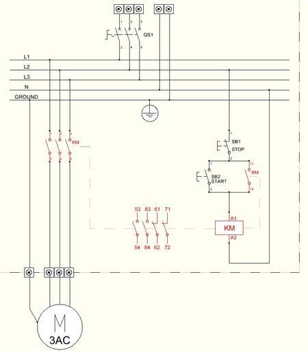 | Keywords: Blocking switch for driving load.jpg en I had lot of questions from beginners how to switch on the load using only Normal-Open NO button -So it is very simple You're pushing the button SB2 current starts to gain through contactor KM There appears circuit hot wire - terminal - SB1 - SB2 and paralel doubled on NO pair 13-14 at relay - contactor KM - zero wire To switch off you should push SB1 button own Dmitry G 2010-06-23 thumb left Lesson 1 - blocking contact driving 1-pole device thumb Lesson 2 - let's complicate 1-st lesson by 3 phases Motor launching circuits Self-blocking button |