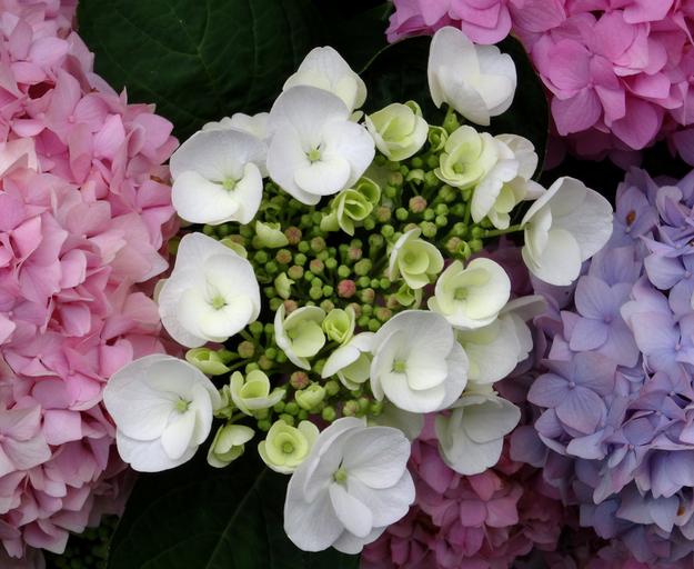 Keywords: blossom bloom hydrangea close white blue pink purple green plate flower beautiful nature flower plant flora garden petals colorful small structure grain gradient