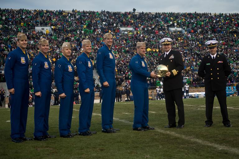 | Keywords: Blue Angels 131102-N-SH953-140.jpg en Cmdr Tom Frosch commanding officer and flight leader of the U S Navy flight demonstration squadron the Blue Angels accepts a University of Notre Dame football helmet from Capt Michael Ryan commanding officer of the University of Notre Dame's Navy Recruit Officer Training Candidate ROTC unit during the National Collegiate Athletic Association NCAA football game between the U S Naval Academy and University of Notre Dame at Notre Dame stadium The helmet was a gift from Notre Dame Football Head Coach Brian Kelly The Blue Angels performed a flyover of the University of Notre Dame Stadium prior to kickoff U S Navy photo by Mass Communication Specialist 2nd Class Kathryn E Macdonald/Released 2013-11-02 Petty Officer 2nd Class Kathryn Macdonald https //www dvidshub net/image/1046694 131102-N-SH953-140 2013-11-04 23 12 PENSACOLA FL US PD-USGov-Military-Navy Notre Dame Stadium Blue Angels Images from DoD uploaded by Fæ |