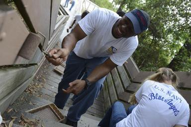 | Keywords: Blue Angels operations 130518-N-SH953-071.jpg en Yeoman 1st Class Raffeal Woods from Atlanta assigned to the U S Navy flight demonstration squadron the Blue Angels paints a boardwalk at Bay Bluffs Park with Boy Scout Troop 36 Although budget cuts have forced the cancellation of 2013 air shows and practice demonstrations the Blue Angels are still committed to their mission of enhancing Navy recruiting and representing the Navy and Marine Corps aviation in their local community for speaking events and volunteer opportunities U S Navy photo by Mass Communication Specialist 2nd Class Kathryn E Macdonald/Released 2013-05-18 Petty Officer 2nd Class Kathryn Macdonald https //www dvidshub net/image/938870 130518-N-SH953-071 2013-05-22 23 21 PENSACOLA FL US PD-USGov-Military-Navy Blue Angels Images from DoD uploaded by Fæ |