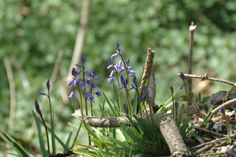 Keywords: blue flowers bluebell harebell wild blossoms blooms blooming greenery green leaves leafy green background woods plants flora