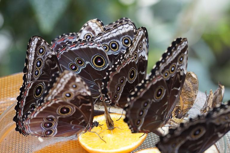 Keywords: blue morpho butterfly rainforest morpho peleides close butterfly house zoo mainau island feeding food fruit orange drink suck proboscis wing many butterflies