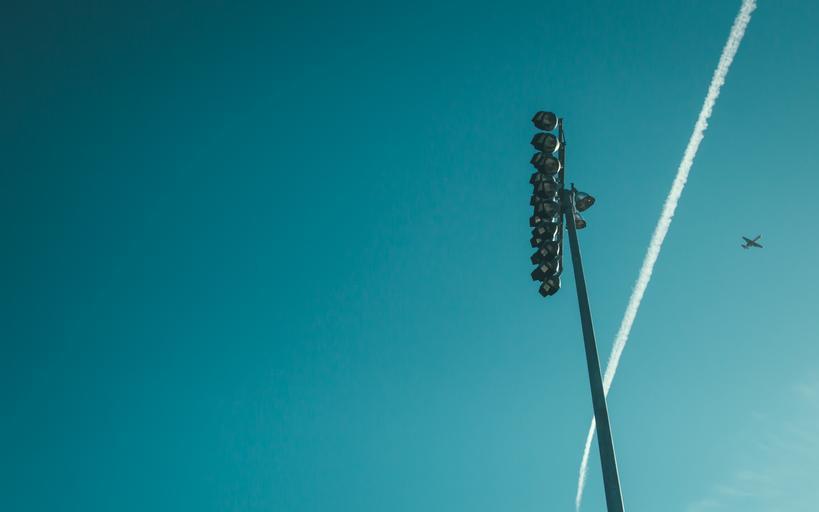Keywords: blue sky airplane contrails travel transportation lamp posts