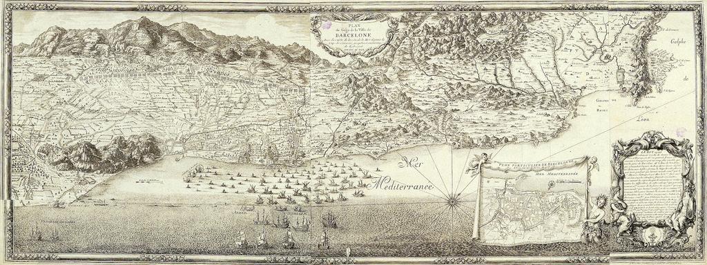 | Keywords: BNE.Barcelona.planos.1698.jpg http //www bne es Biblioteca Nacional de España Lugar geogr Barcelona Sitios Planos 1698 Autores Secun Beaulieu Sébastien de Pontault de 1612-1674 Título Plan du Siège de la ville de Barcelonne Avec la Carte de la côte de la Mer depuis le Cap de Cervera jusqu'aux environs de Llobregat / S de Beaulieu Escala Escala ca 1 43 000 1000 Toises 4 5 cm Publicación A Paris Chez l'autheur rüe St Andrè des arts Porte de Bucy 1698 Descripción 1 mapa grab ; 45 x 119 cm Notas Pertenece a Les glorieuses conquestes de Louis le Grand S de Beaulieu Orientado con rosa con lis con el N al NE del plano - Rumbos - Cultivos y arbolado representados - Relieve por motes de perfil y sombreado En el mar representado combate naval Contenido Inserta Plan particulier de Barcelonne et de ses attaques - Ca 1 2 700 600 Thoises 4 3 cm - 14 x 19 cm - Orientado con rosa con lis con el N al SO del mapa Mapa en cortinaje sostenido por angelotes y sirena - En el ángulo inferior derecho explicación del sitio de Barcelona en cartela con figuras alegóricas PD-old Maps of the history of Barcelona 1698 Siege of Barcelona Maps showing 17th-century history 1698 maps 1698 in art Catalonia in the 1690s Old maps of cities in Catalonia Barcelona |