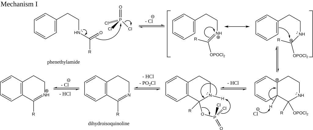 Keywords: BNR rxn imine-ester mechanism.svg Mechanism for the Bischler-Napieralski reaction own UbinusCol 2010-05-04 Bischler-Napieralski reaction