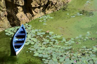 Keywords: boat blue green water pond water lake rock mountain lonely abandoned gun cotton moss the morning buu long dong nai province bien hoa vietnam