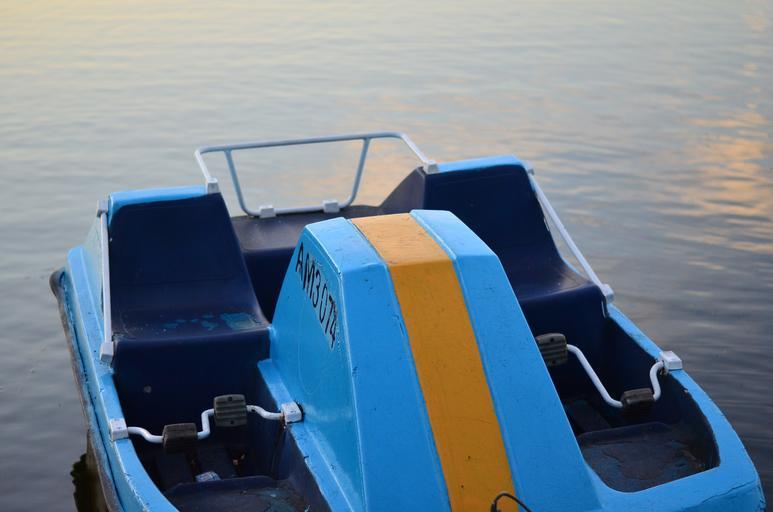 Keywords: boat water transport catamaran river lake sports yellow blue pedals calm water water floats on the river wave