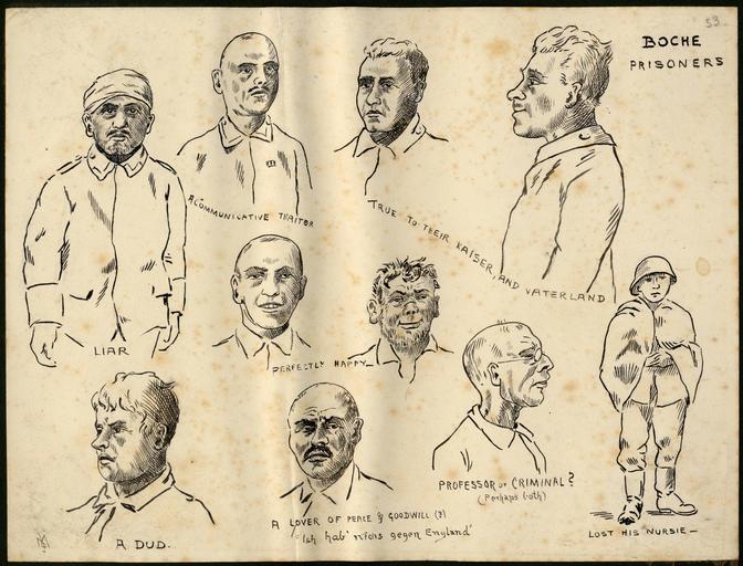 | Keywords: university of victoria universityofvictoria uvic great britain. army. royal regiment of artillery greatbritainarmyroyalregimentofartillery caricatures and cartoons--20th century caricaturesandcartoons20thcentury notebooks war artists warartists world war, 1914-1918--pictorial works worldwar19141918pictorialworks world war, 1914-1918--caricatures and cartoons worldwar19141918caricaturesandcartoons groupshot people drawing sketch cartoon text print indoor writing monochrome Item is one of 123 pen-and-ink drawings and watercolours from two volumes titled: "Sketches of the War: France/Belgium". The sketches vary from satirical cartoons to more detailed and naturalistic renditions. They are often accompanied by an ironic title and are often signed with the artist's initials, "J.M." The artist's satirical targets include the officers and high command of both combatant sides; the disjuncture between reported and actual events, and the death of civilians as a fact of modern warfare. Item is one of 123 pen-and-ink drawings and watercolours from two volumes titled: "Sketches of the War: France/Belgium". The sketches vary from satirical cartoons to more detailed and naturalistic renditions. They are often accompanied by an ironic title and are often signed with the artist's initials, "J.M." The artist's satirical targets include the officers and high command of both combatant sides; the disjuncture between reported and actual events, and the death of civilians as a fact of modern warfare. |