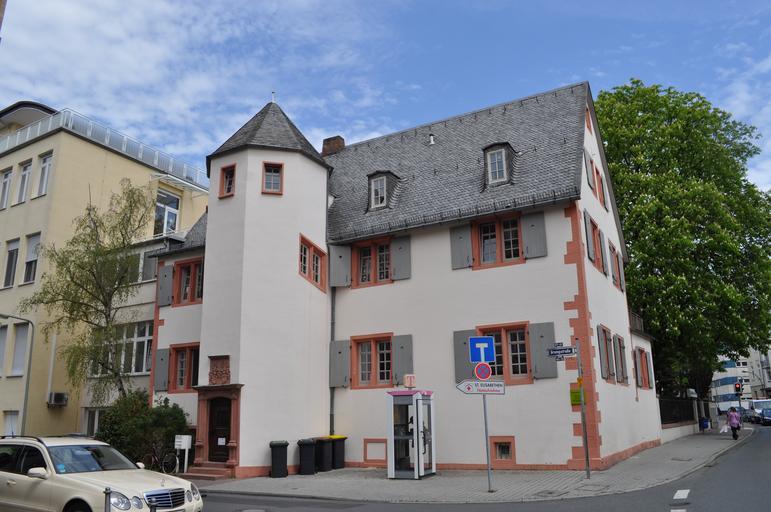 | Keywords: Bockenheim, Grempsches Haus.JPG 50 125572 8 638194 Heraldische Courtoisie Freundlichkeit d h das Wappen des Mannes eigentlich stets rechts wechselt nach links und ist wird dann noch verspiegelt Das männliche Wappentier und seine Helmzier drehen sich zum Wappen der Ehefrau entgegen dem eigentlichen Wappen zu ihrem Schutz Das Wappen der Ehemanns mit seiner Freiherrenkrone wird zudem gleichgroß dargestellt und nicht gegenüber dem bürgerlichen Wappen der Ehefrau vergrößert Ein zusätzlicher Ehrerweis Freiherr Gremp von Freudenstein mit siebenzackiger Freiherrenkrone Wappentier und Helmzier in Anlehnung an den Schwan als Wappentier der Lehnherren der Grafen von Hanau Architektonische Vorgabe scheint das Markgrafenschloß in Emmedingen zu sein wo ein Teil der Familie bis 1588 den sog Grempschen Hof besass Schon unter Kaiser Barbarossa soll die Adelsfamilie Gremp von Freudenstein große Güter in Bockenheim zum Lehen bekommen haben Viele Mitglieder der Familie sind gegenüber dem Haus in der Bockenheimer Jakobskirche beigesetzt dessen Friedhof zwar aufgelassen aber dennoch den 2 Weltkrieg rudimentär überdauerte Auf dem historischen Friedhof der evangelischen Erlöserkirchengemeinde der Stadt Bad Homburg am Untertor findet sich heute noch das Grab von Ernst Friedrich Wolfgang Anton Freiherr Gremp von Freudenstein 1869 “1940 Heute befindet sich hinter dem Grempsches Haus das Elisabethen-Krankenhaus Die Familie Gremp von Freudenstein stammen aus der schwäbischen bürgerlichen Schicht die in den großen südwestdeutschen Städten Macht und Ansehen besaß Eine Urahnin Agathe von Gremp geb Besserer von Ulm ca 1490-1550 hatte verwandtschaftliche Beziehungen zu den großen Kaufmannsfamilien Voehlin und Welser Mitte des 16 Jahrhunderts wurde sie in den erblichen freiherrlichen Adelsstand erhoben Diese Familie stellte hohe Beamte Offiziere Diplomaten und Minister Zweige von ihr gehörten zur Reichsritterschaft in Schwaben im Elsaß am Mittelrhein und in der Wetterau Auch zählten sie zu der Ganerbschaft der Reichsburgen Gelnhausen und Friedberg Hessen So war 1610 ein Wilhelm Gremp von Freudenstein Gräflicher Rat und Amtmann der Grafen von Hanau-Lichtenberg Mit der Adelsfamilie derer von Gayling waren die Gremp von Freudenstein befreundet und verschwägert Das schönste Fachwerkhaus von Babenhausen seit 1456 zur Grafschaft Hanau-Lichtenberg gehörend mit reichem Fachwerk das spätere Pfarrhaus in der Backhausgasse gehörte 1641 den Brüdern Ludwig und Wilhelm Gremp von Freudenstein jeweils verheirate mit Magdalene von Gayling bzw mit Dorothea Susanna von Gayling Ein Christopfe der Vogt von Buchsweiler Bouxwiller Bas-Rhin Alsace von 1602 bis 1634 war residierte in der rue de juifs im 1591 erbauten Maison Gremp von Freudenstein später mehrfach erweitert und angebaut Das Grempschen Hauses in Frankfurt Bockenheim ist der bauliche Rest eines verschwundenen Rittergutes das angeblich über einen eigenen Zugang zur gegenüberliegenden Jakobuskirche verfügte à ber dem Eingang des markanten mehreckigen Treppenturm befindet sich heute noch das Wappen der Familie Gremp von Freudenstein einen Schwan der auf drei kleine Hügeln ruht und in seinem Schnabel einen Ring hält Das gleiche Wappen ziert heute noch das Maison Gremp in Buchsweiler Bouxwiller Bas-Rhin Alsace Ca 200 Jahre später verkauft 1771 Baron Johann Wolfgang Adam Gremp von Freudenstein aus der Burg Gelnhausen das Gutes von an Prinzessin Henriette Amalie von Anhalt-Dessau siehe Archivaliensignatur Landeshauptarchiv Sachsen-Anhalt Z 284 Nr 345 Benutzungsort Dessau Alt-/Vorsignatur Abt Dessau C 4 G Nr 11 Bd 8; Filmsignatur 6301 2012-04-27 own Karsten Ratzke cc-zero Uploaded with UploadWizard Grempsches Haus |
