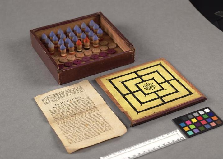Keywords: Bodleian Libraries, Belagerungs Spiel 82.jpg accession number Games 28 1 credit line Game entitled Belagerungs Spiel; box containing 24 bullets with orange bases and blue pointed tops 2 bullets with black bases and orange tops Also 12 'white' draughts pieces and 12 purple draughts pieces Rules are in German and French Board for Belagerungs Spiel is on box lid Draughts on base of box Another board on bottom of lid In Johnson copy the rules are foxed Games 28 1 has green box Games 28 2 has brown box; Jeu de siˆge; Play of siege; Image 2 box single sheet 50 pieces; 174 x 178 x 40 box mm exhibition history Games 28 2 ; Allegro identifier 20040903/11 50 04 jl object history object type Licensed-PD-Art PD-old-100 cc-by-4 0 place of creation place of discovery http //digital bodleian ox ac uk/inquire/p//90648de7-7d09-430d-9837-5dea3946a9f8 Digital Bodleian Template John Johnson Belagerungs Spiel Uploaded with GWToolset Bodleian Libraries Belagerungs Spiel_82 http //iiif bodleian ox ac uk/iiif/image/0af5ba5d-9bc4-4548-b346-4b2ebc36024e/full/ 1000 1000/0/default jpg Files uploaded by the Bodleian Libraries' Wikimedian In Residence Board games Draughts Sieges Soldiers Artillery weaponry