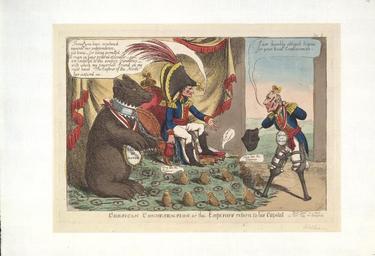 Keywords: Bodleian Libraries, Corsican condesension or- the emperors return to his capital.jpg Satire on the Napoleonic wars British political cartoon ; Satire after the Treaty of Tilsit June 1807 A mutilated Frederick William III of Prussia approaches Napoleon on his throne On Napoleon's right hand is the Russian bear; the Dutch frogs croak at his feet ; Publisher's number Pan 3 Pencil note in margin WilliamsNot in BMC 244 x 346 platemark ; 229 x 328 image and text mm exhibition history Source filename politi004-aon-0001-0 object history object type Licensed-PD-Art PD-old-100 cc-by-4 0 place of creation London England Thomas Tegg place of discovery http //digital bodleian ox ac uk/inquire/p//9237b724-7f2c-4794-ad8d-49da760207f6 Digital Bodleian Template Bodleian Libraries Corsican condesension or the emperors return to his capital Uploaded with GWToolset Bodleian Libraries Corsican condesension or the emperors return to his capital http //iiif bodleian ox ac uk/iiif/image/9237b724-7f2c-4794-ad8d-49da760207f6/full/ 1000 1000/0/default jpg Files uploaded by the Bodleian Libraries' Wikimedian In Residence Napoleonic Wars Alexander I of Russia in caricatures Caricatures of Napoleon I of France Friedrich Wilhelm III of Prussia Medicine in art Curzon Collection |