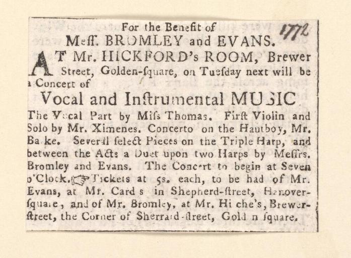 | Keywords: Bodleian Libraries, For the benefit of Mess. Bromley and Evans.jpg Newscutting relating to Hickford's Room announcing a concert for the benefit of Mr Bromley; Vocal part by Miss Thomas; First violin and solo by Mr Ximenes; Concerto on the hautboy; Several select pieces on the harp; Duet upon two harps by Messrs Bromley and Evans; For the benefit of Mess Bromley and Evans single sheet; 45 x 61 mm exhibition history At Mr Hickford's Room Brewer Street Golden-square on Tuesday next will be a concert of vocal and instrumental music Allegro identifier 20030530/17 35 55 hm object history object type Licensed-PD-Art PD-old-100 cc-by-4 0 place of creation place of discovery http //digital bodleian ox ac uk/inquire/p//2af852e3-1d94-4001-bd62-cbfa3c0116ed Digital Bodleian Template John Johnson For the benefit of Mess Bromley and Evans Uploaded with GWToolset Bodleian Libraries For the benefit of Mess Bromley and Evans http //iiif bodleian ox ac uk/iiif/image/2af852e3-1d94-4001-bd62-cbfa3c0116ed/full/ 1000 1000/0/default jpg Files uploaded by the Bodleian Libraries' Wikimedian In Residence Concerts in London Violins Harps Singing Clippings |