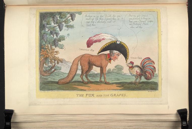Keywords: Bodleian Libraries, The fox and the grapes.jpg accession number Curzon b 26 186 Creator George Moutard Woodward artist Satire on the Peninsular war British political cartoon 254 x 345 platemark mm exhibition history Source filename politi004-aye-0001-0 object history object type Licensed-PD-Art PD-old-100 cc-by-4 0 place of creation London England R Ackermann place of discovery http //digital bodleian ox ac uk/inquire/p//3489497e-8bf3-4b7d-847c-2c2bd61dd190 Digital Bodleian Template Bodleian Libraries The fox and the grapes Uploaded with GWToolset Bodleian Libraries The fox and the grapes http //iiif bodleian ox ac uk/iiif/image/3489497e-8bf3-4b7d-847c-2c2bd61dd190/full/ 1000 1000/0/default jpg Files uploaded by the Bodleian Libraries' Wikimedian In Residence Napoleonic Wars Peninsular War Caricatures of Napoleon I of France Animals in art Curzon Collection