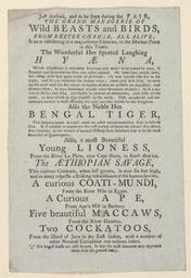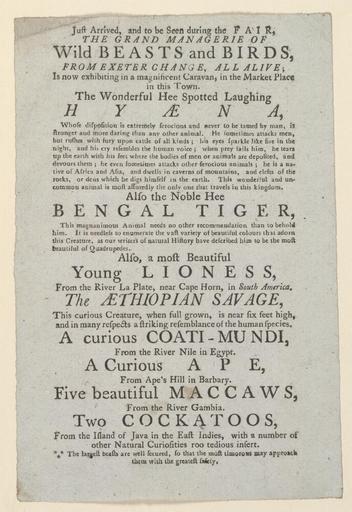 Keywords: Bodleian Libraries, Handbill of 1790, announcing The grand menagerie sic of wild beasts and birds, from Exeter Change.jpg Handbill of 1790 announcing The grand menagerie sic of wild beasts and birds from Exeter Change; Grand menagerie sic of wild beasts and birds from Exeter Change; Just arrived and to be seen during the fair the grand managerie sic of wild beasts and birds from Exeter Change all alive; is now exhibiting in a magnificent caravan in the market place in this town The wonderful hee spotted laughing hyena ; Pidcock's exhibition of wild beasts; Handbill of 1790 announcing The grand menagerie sic of wild beasts and birds from Exeter Change single sheet; 189 x 125 mm exhibition history 003769; t161013 object history object type Licensed-PD-Art PD-old-100 cc-by-4 0 place of creation place of discovery http //digital bodleian ox ac uk/inquire/p//6e2c7cd6-72cc-4dbd-9d60-94b6e8853b46 Digital Bodleian Template John Johnson Handbill of 1790 announcing The grand menagerie sic of wild beasts and birds from Exeter Change Uploaded with GWToolset Bodleian Libraries Handbill of 1790 announcing The grand menagerie sic of wild beasts and birds from Exeter Change http //iiif bodleian ox ac uk/iiif/image/6e2c7cd6-72cc-4dbd-9d60-94b6e8853b46/full/ 1000 1000/0/default jpg Files uploaded by the Bodleian Libraries' Wikimedian In Residence Hyaenidae Tigers in art Panthera leo Coatis Hominoidea Parrots in art Exhibitions Menageries |