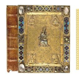 | Keywords: Bodleian Libraries, Homiliae variae.jpg Treasure binding German late 12th or early 13th century Faded red velvet over wooden boards Upper cover fashioned from gilt metal plate sunk into wood decorated with jewels rock crystal and antique cameos; with central figure of a seated king and four evangelists worked in metal relief Jewelled or 'treasure' bindings such as were designed to be carried in procession and displayed during major church services Although both the manuscript from the Cistercian abbey of Himmerod in the diocese of Trier and the cover date from the same period scholars now doubt whether they were originally made to be together exhibition history Spine and front board source filename oulis2009-atb-0090-0 tif object history object type Licensed-PD-Art PD-old-100 cc-by-4 0 place of creation place of discovery http //digital bodleian ox ac uk/inquire/p//ac755f47-6b8a-4c81-92dc-470044389147 Digital Bodleian Template Bodleian Libraries Homiliae variae Uploaded with GWToolset Bodleian Libraries Homiliae variae http //iiif bodleian ox ac uk/iiif/image/ac755f47-6b8a-4c81-92dc-470044389147/full/ 1000 1000/0/default jpg Files uploaded by the Bodleian Libraries' Wikimedian In Residence Bookbinding |