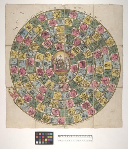 | Keywords: Bodleian Libraries, Jubilee. A new and interesting game.jpg Game of 1810 entitled The jubilee A new and interesting game; game has 150 squares representing events in the reign of George III some just pictorial others with some text Mounted on linen and folded in original slip case with hand-coloured label Johnson copy of the board has stamped letters at top left Tynyr L ; War with Spain; Ich dien; Peace; Duke of York born; Duke of Clarence born; Stamps; First meeting of Congress at New York; Princess Charlotte Augusta Matilda; Duke of Kent born; Hyder Ali's fleet taken; Princess Augusta Sophia; Princess Elizabeth; Prince Ernest; Mr Bruce discovers the Nile; Duke of Sussex 1773; King reviews the fleet; Duke of Cambridge; Princess Sophia born; Earl of Chatham; Prince Octavius; Admiral Rodney victory; No popery riots in London; Prince Alfred born Died; Gibraltar; Quis separabit MDCCLXXXIII; Peace; Handel; Commerce with France Commercial treaty; Botany Bay; Kings alarming illness; General thanksgiving for the recovery of his Majesty; Convention between Great Britain and Spain; Riots at Birmingham; War commences between Britain and France; Magna Charta; Valenciennes retaken; Spain declare war; Mutiny; Erin Gobrah Rebellion in Ireland; Defeat at ; Dutch fleet surrender in the ; Bread prohibeted sic till it had been baked 24 hours; Embargo; Peace proclamed; War declared against France; Hanover taken by the French; Bank of England 1804 ; Trafalgar; Abolition of the slave trade; Laying the foundation of Downing College Cambridge; Danish navy; 12 000 Spanish troups; Sir John Moore Aug 17 1809; Vaccine estabishm Jan 16 1808; Colin Wardle Mrs Claridge ; Duke of York resigns his office; Jubilee; Image 2 slip case single sheet; 195 x 138 x 8 slip case mm; 557 x 532 board mm exhibition history Allegro identifier 20030929/18 39 37 jl object history object type Licensed-PD-Art PD-old-100 cc-by-4 0 place of creation London England John Harris place of discovery http //digital bodleian ox ac uk/inquire/p//fc074cd3-9397-4736-8dec-a9769b57bd87 Digital Bodleian Template John Johnson Jubilee A new and interesting game Uploaded with GWToolset Bodleian Libraries Jubilee A new and interesting game http //iiif bodleian ox ac uk/iiif/image/5ead8da3-b69f-4127-bb05-ff8883e4670c/full/ 1000 1000/0/default jpg Files uploaded by the Bodleian Libraries' Wikimedian In Residence Game boards Great Britain History--1789-1820 George |