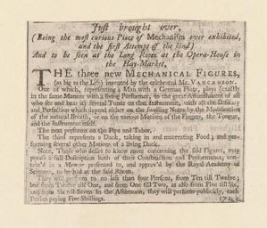 | Keywords: Bodleian Libraries, Just brought over, (being the most curious piece of mechanism ever exhibited, and the first attempt of the kind) and to be seen at the Long Room at the Opera House in the Hay-market.jpg Newscutting relating to the Long Room 1742 announcing mechanical musical instruments and other mechanical exhibits; 1742 manuscript ; Man with a German flute; Man playing the pipe and tabor; Duck; Just brought over being the most curious piece of mechanism ever exhibited and the first attempt of the kind and to be seen at the Long Room at the Opera House in the Hay-market single sheet; 68 x 82 mm exhibition history Three new mechanical figures as big as the life invented by the celebrated Mr Vauncanson One of which representing a man Allegro identifier 20030523/11 16 54 hm object history object type Licensed-PD-Art PD-old-100 cc-by-4 0 place of creation place of discovery http //digital bodleian ox ac uk/inquire/p//64d14536-6073-4e3f-9422-68a679454be0 Digital Bodleian Template John Johnson Just brought over being the most curious piece of mechanism ever exhibited and the first attempt of the kind and to be seen at the Long Room at the Opera House in the Hay-market Uploaded with GWToolset Bodleian Libraries Just brought over being the most curious piece of mechanism ever exhibited and the first attempt of the kind and to be seen at the Long Room at the Opera House in the Hay-market http //iiif bodleian ox ac uk/iiif/image/64d14536-6073-4e3f-9422-68a679454be0/full/ 1000 1000/0/default jpg Files uploaded by the Bodleian Libraries' Wikimedian In Residence Musical instruments Exhibitions Mechanical toys Pipes Tabor Robots Clippings automata |