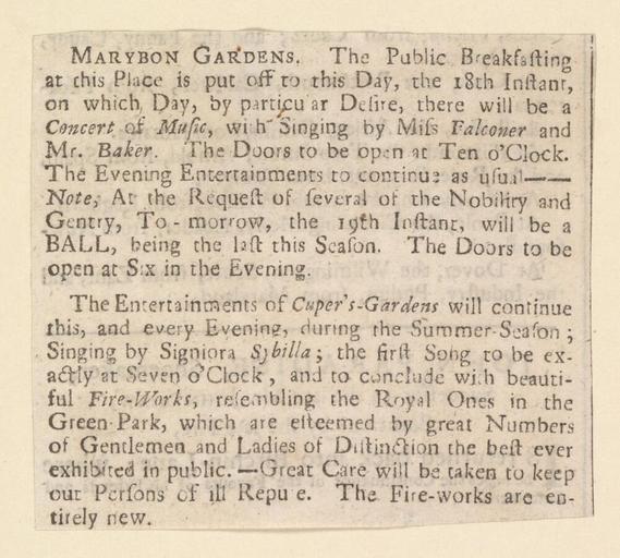 | Keywords: Bodleian Libraries, Marybon Gardens.jpg Newscutting relating to Marylebone Gardens 18th inst announcing A concert of music; Concert of music; Ball; Public breakfasting; Marybon Gardens single sheet; 37 x 83 mm exhibition history Public breakfasting at this place is put off to Tuesday next the 19th inst on which day by particular desire there will be a concert of music with singing by Miss Falconer and Mr Baker Allegro identifier 20030605/12 12 45 hm object history object type Licensed-PD-Art PD-old-100 cc-by-4 0 place of creation place of discovery http //digital bodleian ox ac uk/inquire/p//464abaac-8010-42a8-a22f-71fcf71ffdf5 Digital Bodleian Template John Johnson Marybon Gardens Uploaded with GWToolset Bodleian Libraries Marybon Gardens http //iiif bodleian ox ac uk/iiif/image/464abaac-8010-42a8-a22f-71fcf71ffdf5/full/ 1000 1000/0/default jpg Files uploaded by the Bodleian Libraries' Wikimedian In Residence Breakfasts Concerts in London Balls dance Clippings |
