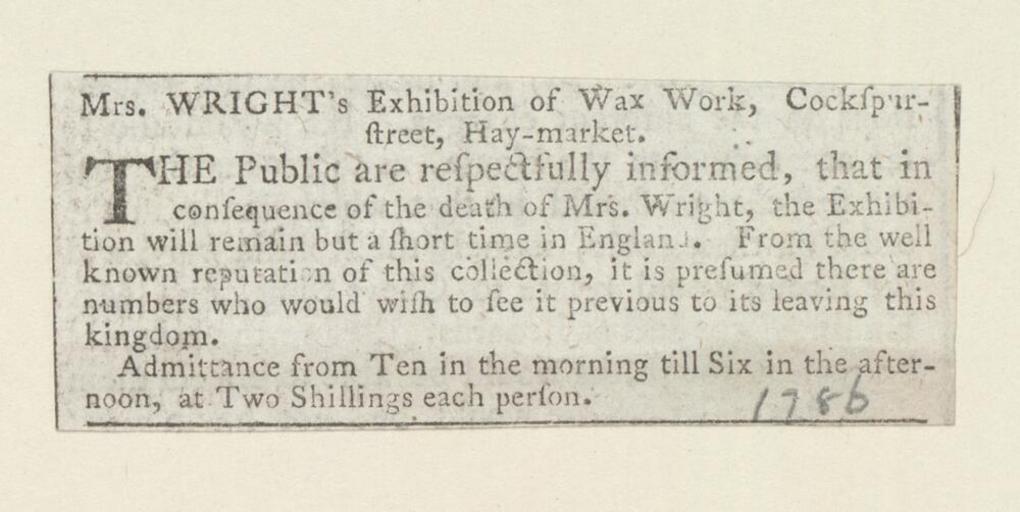 | Keywords: Bodleian Libraries, Mrs. Wright's exhibition of wax work, Cockspur-street, Hay-market.jpg Newscutting relating to Mrs Wright's exhibition of waxworks; 1786 manuscript ; Mrs Wright's exhibition of waxworks; Mrs Wright's exhibition of wax work Cockspur-street Hay-market single sheet; 27 x 71 mm exhibition history Public are respectfully informed that in consequence of the death of Mrs Wright the exhibition will remain but a short time in England Allegro identifier 20030527/17 00 52 hm object history object type Licensed-PD-Art PD-old-100 cc-by-4 0 place of creation place of discovery http //digital bodleian ox ac uk/inquire/p//019a5fce-73e5-46fd-ae5d-a343c474206a Digital Bodleian Template John Johnson Mrs Wright's exhibition of wax work Cockspur-street Hay-market Uploaded with GWToolset Bodleian Libraries Mrs Wright's exhibition of wax work Cockspur-street Hay-market http //iiif bodleian ox ac uk/iiif/image/019a5fce-73e5-46fd-ae5d-a343c474206a/full/ 1000 1000/0/default jpg Files uploaded by the Bodleian Libraries' Wikimedian In Residence Exhibitions Waxworks plastic arts Clippings Wright Mrs |