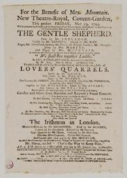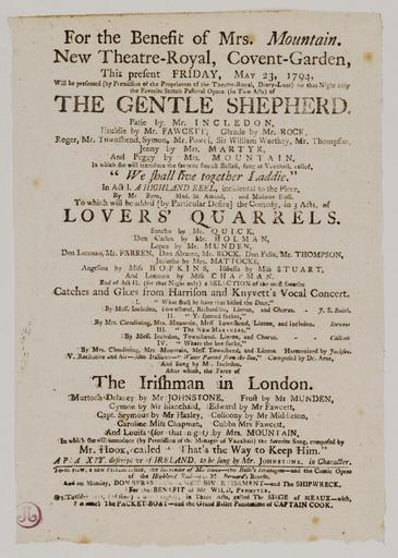 Keywords: Bodleian Libraries, Playbill of Covent Garden, Friday, May 23, 1794, announcing The gentle shepherd &c..jpg Playbill of Covent Garden Friday May 23 1794 announcing The gentle shepherd c for the benefit of Mrs Mountain; Gentle shepherd; We shall live together laddie; Highland reel; Lovers' quarrels; Catches and glees from Harrison and Knyvett's vocal concert; What shall he have that killed the deer; Ye spotted snakes; New mariners; Where the bee sucks; Water parted from the sea; Irishman in London; That's the way to keep him; Planxty descriptive of Ireland; Surrender of Martinico; Belle's stratagem; Highland reel; Don Sebastian; Shipwreck; Siege of Meaux; Packet-boat; Captain Cook; Playbill of Covent Garden Friday May 23 1794 announcing The gentle shepherd c single sheet; 255 x 179 mm exhibition history For the benefit of Mrs Mountain Allegro identifier 20010706/09 08 44 af object history object type Licensed-PD-Art PD-old-100 cc-by-4 0 place of creation s l England s n place of discovery http //digital bodleian ox ac uk/inquire/p//71d4430a-cda4-4e30-968c-36e370d4320c Digital Bodleian Template John Johnson Playbill of Covent Garden Friday May 23 1794 announcing The gentle shepherd c Uploaded with GWToolset Bodleian Libraries Playbill of Covent Garden Friday May 23 1794 announcing The gentle shepherd c http //iiif bodleian ox ac uk/iiif/image/71d4430a-cda4-4e30-968c-36e370d4320c/full/ 1000 1000/0/default jpg Files uploaded by the Bodleian Libraries' Wikimedian In Residence Playbills Scotch pastoral opera Harrison Samuel |