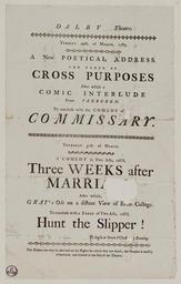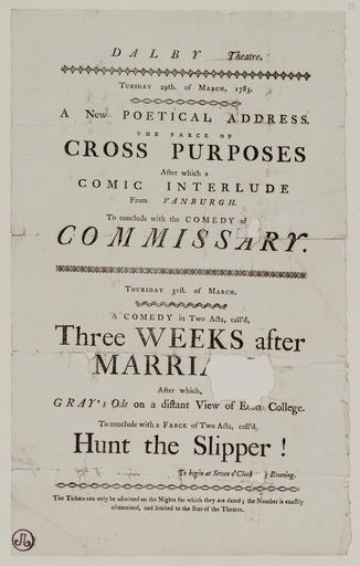 | Keywords: Bodleian Libraries, Playbill of Dalby Theatre, Tuesday 29th. of March, Thursday 31st. of March 1785, announcing Cross purposes &c..jpg  Playbill of Dalby Theatre Tuesday 29th of March Thursday 31st of March 1785 announcing Cross purposes c ; bill has plays for 29th and 31st of March Badley creased and torn with hole affecting word 'marriage'; Cross purposes; Comic interlude; Commissary; Three weeks after marriage; Gray's ode on a distant view of Eton College; Hunt the slipper; Playbill of Dalby Theatre Tuesday 29th of March Thursday 31st of March 1785 announcing Cross purposes c single sheet; 321 x 200 mm exhibition history New poetical address 011087 object history object type Licensed-PD-Art PD-old-100 cc-by-4 0 place of creation s l England s n place of discovery http //digital bodleian ox ac uk/inquire/p//158375ef-49f5-4458-9b31-38307f1c6f5d Digital Bodleian Template John Johnson Playbill of Dalby Theatre Tuesday 29th of March Thursday 31st of March 1785 announcing Cross purposes c Uploaded with GWToolset Bodleian Libraries Playbill of Dalby Theatre Tuesday 29th of March Thursday 31st of March 1785 announcing Cross purposes c http //iiif bodleian ox ac uk/iiif/image/158375ef-49f5-4458-9b31-38307f1c6f5d/full/ 1000 1000/0/default jpg Files uploaded by the Bodleian Libraries' Wikimedian In Residence Theater England--Dalby--History--18th century Playbills farce |