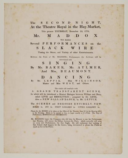 | Keywords: Bodleian Libraries, Playbill (facsimile) of Haymarket Theatre, Thursday, December 13, 1770, announcing A grand transparent scene &c..jpg Playbill facsimile of Haymarket Theatre Thursday December 13 1770 announcing A grand transparent scene c ; facsimile ; Grand transparent scene; Love and resolution; New ballad dance; Playbill facsimile of Haymarket Theatre Thursday December 13 1770 announcing A grand transparent scene c single sheet; 284 x 227 mm exhibition history Mr Maddox will exhibit several performances on the slack wire Allegro identifier 20020322/15 28 09 af object history object type Licensed-PD-Art PD-old-100 cc-by-4 0 place of creation s l England s n place of discovery http //digital bodleian ox ac uk/inquire/p//335bddd1-2e04-42d6-9d8c-f4e65cf7a717 Digital Bodleian Template John Johnson Playbill facsimile of Haymarket Theatre Thursday December 13 1770 announcing A grand transparent scene c Uploaded with GWToolset Bodleian Libraries Playbill facsimile of Haymarket Theatre Thursday December 13 1770 announcing A grand transparent scene c http //iiif bodleian ox ac uk/iiif/image/335bddd1-2e04-42d6-9d8c-f4e65cf7a717/full/ 1000 1000/0/default jpg Files uploaded by the Bodleian Libraries' Wikimedian In Residence Tightrope walking Child actors Playbills transparency slack wire performer |