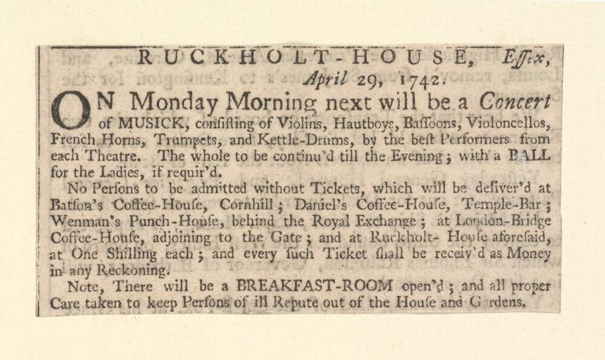 | Keywords: Bodleian Libraries, Ruckholt-House, Essex.jpg Newscutting relating to Ruckholt House April 29th 1742 announcing A concert of musick; Note There will be a Breakfast-Room open'd; and all proper care taken to keep persons of ill repute out of the House and Gardens ; Concert of musick; Ball for the ladies; Ruckholt-House Essex single sheet; 42 x 82 mm exhibition history On Monday morning next will be a concert of musick consisting of violins hautboys bassoons violoncellos French horns trumpets and kettle-drums by the best performers from each theatre Allegro identifier 20030603/16 46 56 hm object history object type Licensed-PD-Art PD-old-100 cc-by-4 0 place of creation place of discovery http //digital bodleian ox ac uk/inquire/p//4c643201-8035-4760-b54b-1a5d555205e5 Digital Bodleian Template John Johnson Ruckholt-House Essex Uploaded with GWToolset Bodleian Libraries Ruckholt-House Essex http //iiif bodleian ox ac uk/iiif/image/4c643201-8035-4760-b54b-1a5d555205e5/full/ 1000 1000/0/default jpg Files uploaded by the Bodleian Libraries' Wikimedian In Residence Concerts England--History--18th century Singing Instrumental music Violins Oboes Bassoons Cellos French horn Trumpets in art Drum Clippings |