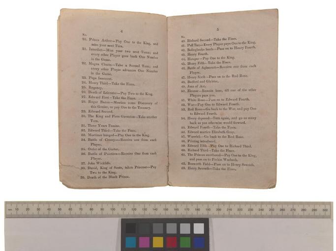 Keywords: Bodleian Libraries, Rules and directions for playing the Historical pastime or new game of the History of England 163.jpg Game entitled Rules and directions for playing the Historical pastime or new game of the History of England; This game comprehends one hundred and thirty two of the principal circumstances in the History of England commencing with the Battle of Hastings and ending with George the Fourth with appropriate fines or rewards to most of the subjects It is played with a tetotum numbered from 1 to 8 Each player proceeds in the game according to the number he turns and receives the reward or pays the fine appointed There are likewise twelve letters one of which each player must draw; and he who draws the earliest in the alphabet takes the privilege of turning first and the others in rotation Each player must place his letter on the circumstance to which he turns to show his situation in the game If any player turns to that subject on which another has his letter he takes that place and the other moves one forward except at the Holy Lane where as many may be placed as chance may send Each player advances in the game by adding the figure that he turns to the number on which his letter stands Any number of persons may play; and he who arrives first at the Treasury wins the game takes the stakes and all forfeits that remain No 1 Battle of Hastings - pay one to the King No 2 William the Conqueror Take all fines that have been paid to him No 3 Doom's-day book - where every player must enter before he can proceed etc ; Historical pastime or new game of the History of England; Image 4 booklet 24p ; 165 x 105 mm exhibition history Allegro identifier 20030930/17 45 05 jl object history object type Licensed-PD-Art PD-old-100 cc-by-4 0 place of creation London England E Wallis place of discovery http //digital bodleian ox ac uk/inquire/p//1422e4df-dbeb-4904-a576-1f017cb427c0 Digital Bodleian Template John Johnson Rules and directions for playing the Historical pastime or new game of the History of England Uploaded with GWToolset Bodleian Libraries Rules and directions for playing the Historical pastime or new game of the History of England_163 http //iiif bodleian ox ac uk/iiif/image/30cdf971-1c6f-4462-99ce-7acb05bcb826/full/ 1000 1000/0/default jpg Files uploaded by the Bodleian Libraries' Wikimedian In Residence Board game rules History of Great Britain |
