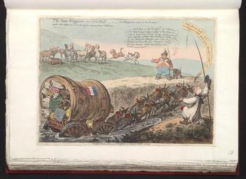 Keywords: Bodleian Libraries, The state waggoner, and John Bull, or - The waggon too much for the donkeys together with a distant view of the new co.jpg accession number Curzon b 4 79 Satire on the fear of French invasion 1794-1805 British political cartoon ; A satire on the incompetence of the Addington ministry Addington is the driver whose wagon is stuck in the mire Opposition politicians represented by horses in the background begin to group into possible coalitions 270 x 371 sheet mm exhibition history Source filename politi004-abh-0001-0 object history object type Licensed-PD-Art PD-old-100 cc-by-4 0 place of creation London England Hannah Humphrey place of discovery http //digital bodleian ox ac uk/inquire/p//e27e07cc-9a20-4124-8d5c-d10da95ffb0d Digital Bodleian Template Bodleian Libraries The state waggoner and John Bull -- or -- The waggon too much for the donkeys -- together with a distant view of the new coalition among Johnny's old horses Uploaded with GWToolset Bodleian Libraries The state waggoner and John Bull or The waggon too much for the donkeys together with a distant view of the new co http //iiif bodleian ox ac uk/iiif/image/e27e07cc-9a20-4124-8d5c-d10da95ffb0d/full/ 1000 1000/0/default jpg Files uploaded by the Bodleian Libraries' Wikimedian In Residence 1804 works in the United Kingdom Napoleonic Wars George Spencer 2nd Earl Spencer Frederick Howard 5th Earl of Carlisle James Maitland 8th Earl of Lauderdale Thomas Erskine 1st Baron Erskine William Wilberforce Charles Howard 11th Duke of Norfolk Charles Grey 2nd Earl Grey George Nugent-Temple-Grenville 1st Marquess of Buckingham Caricatures of William Pitt the Younger George Canning Charles James Fox William Grenville 1st Baron Grenville William Windham Richard Brinsley Sheridan Animals in art Anthropomorphic animals John Bull Military Militias Curzon Collection |