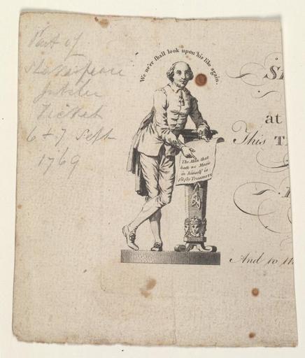 View Original:Bodleian Libraries, Ticket of Stratford, 6 + 7 Sept 1769, announcing the Shakespeare Jubilee Festival.jpg (851x1000)