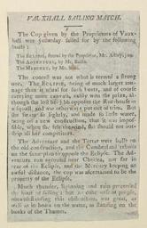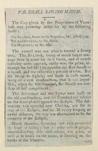 Keywords: Bodleian Libraries, Vauxhall Sailing Match.jpg Newscutting relating to a Sailing match; Sailing match; Vauxhall Sailing Match single sheet; 109 x 68 mm exhibition history Cup given by the proprietors of Vauxhall was yesterday sailed for by the following boats the Eclipse steered by the proprietor Mr Astley jun The Adventure by Mr Bailis The Mercury by Mr Sims Allegro identifier 20030609/10 22 22 hm object history object type Licensed-PD-Art PD-old-100 cc-by-4 0 place of creation place of discovery http //digital bodleian ox ac uk/inquire/p//66be68cb-5335-4b69-9767-4d244bc3b4db Digital Bodleian Template John Johnson Vauxhall Sailing Match Uploaded with GWToolset Bodleian Libraries Vauxhall Sailing Match http //iiif bodleian ox ac uk/iiif/image/66be68cb-5335-4b69-9767-4d244bc3b4db/full/ 1000 1000/0/default jpg Files uploaded by the Bodleian Libraries' Wikimedian In Residence Clippings Prizes Rivers in art Blackfriars Bridge London England Westminster Bridge London England Vauxhall Gardens sailing match Roberts Mr |