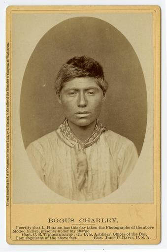 | Keywords: people photo border ancient Repository: California Historical Society Collection: Photographic portraits of Modoc Indians of the Modoc War Photographer: Heller, Louis Herman Date: 1873 General note: Printed on mounts: I certify that L. Heller has this day taken the photographs of the above Modoc Indian prisoner under my charge. Capt. C.B. Throckmorton, 4th U.S. Artillery, Officer of the Day. I am cognizant of the above fact. Gen. Jeff. C. Davis, U.S.A. General note: Photos were published by Carleton E. Watkins. Watkins' Yosemite Art Gallery advertisement on verso. Format: Carte de visite Call Number: PC 006 Digital object ID: PC 006_12.jpg Preferred citation: Bogus Charley, Photographic portraits of Modoc Indians of the Modoc War, PC 006, courtesy, California Historical Society, PC 006_12.jpg Repository: California Historical Society Collection: Photographic portraits of Modoc Indians of the Modoc War Photographer: Heller, Louis Herman Date: 1873 General note: Printed on mounts: I certify that L. Heller has this day taken the photographs of the above Modoc Indian prisoner under my charge. Capt. C.B. Throckmorton, 4th U.S. Artillery, Officer of the Day. I am cognizant of the above fact. Gen. Jeff. C. Davis, U.S.A. General note: Photos were published by Carleton E. Watkins. Watkins' Yosemite Art Gallery advertisement on verso. Format: Carte de visite Call Number: PC 006 Digital object ID: PC 006_12.jpg Preferred citation: Bogus Charley, Photographic portraits of Modoc Indians of the Modoc War, PC 006, courtesy, California Historical Society, PC 006_12.jpg |