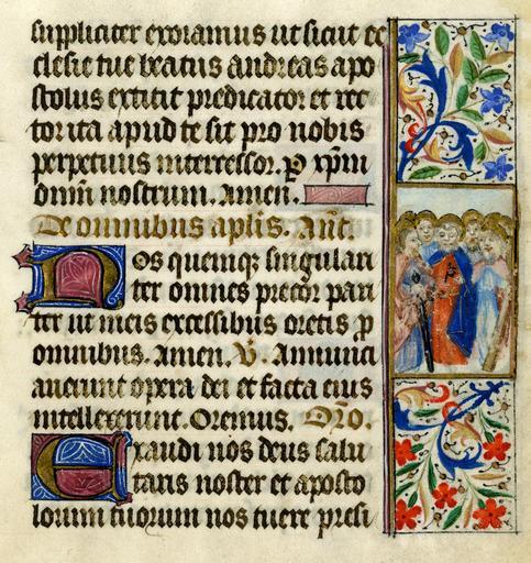 Keywords: Boise State MSS 122 2 crop.jpeg Assessments 1 suppliciter exoramus ut sicut ecclesiae tuae beatus andreas apostolus exstitit praedicator et rector ita apud te sit pro nobis perpetuus intercessor per dominum nostrum iesum christum amen nos quemque singulariter omnes precor pariter ut meis excellibus oretis pro omnibus amen annuntiaverunt opera dei et facta ejus intellexerunt oremus exaudi nos deus salutaris noster et apostolorum tuorum nos tuere presi <br> A page from the 15th century French illuminated manuscript MSS 122 in the Boise State University Library Special Collections Dimensions 9 × 8 5 cm The manuscript is from a book of hours and the page shown partially covers the liturgy of the octave of Saint Andrew <br> English translation <br> We humbly entreat Thy majesty O Lord that just as the blessed Apostle Andrew was once a preacher and guide to the faithful so he may now be a perpetual advocate on behalf of us before Thee Through Jesus Christ our Lord Amen Each and every one of us prays together that you may intervene on behalf of us all upon our departure from this life Amen And they declared the works of God and understood his acts Let us pray Graciously hear us O Lord our Saviour and protect us with the fortress of your apostles Page du manuscrit enluminé français du XV<sup>e</sup> siècle MSS122 de la collection spéciale de la bibliothèque de l'université d'état de Boise Idaho Etats-Unis Dimensions 9 × 8 5 cm Ce manuscrit est un livre d'heures et la page présentée ici donne la liturgie de l'octave de Saint André <br> Traduction du texte latin <br> Nous supplions humblement ta majesté ô Seigneur que tout comme le bienheureux apôtre André fut un prédicateur et un guide pour les fidèles ainsi il peut maintenant être notre intercesseur perpétuel devant toi Par Jésus Christ notre Seigneur Amen Chacune et chacun d'entre nous prie ensemble que interveniez au nom de nous tous lors de notre départ de cette vie Amen Et ils ont déclaré les œuvres de Dieu et compris ses actes Prions Exauce-nous ô Seigneur notre Sauveur et protège-nous avec la forteresse de tes apôtres http //library boisestate edu/special/illuminatedmanuscript shtm Boise State University Library ~ 1480 author thumb left Uncropped PD-old-100 Illuminated manuscripts made in France 15th-century illuminated manuscripts Boise State University Illuminated breviaries Featured pictures of Idaho Featured pictures by Claritas |