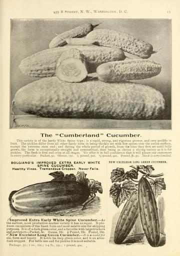 MAKE A MEME View Large Image Bolgiano's 1902 catalogue (15730034733).jpg 935 B Street N W Washington D C <br> The Cumberland Cucumber <br> This variety is of the hardy White Spine type ; is a rapid strong and vigorous grower and very prolific in <br> fruit The pickles ...