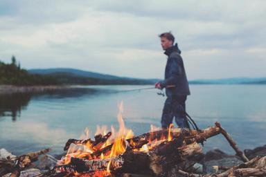 Keywords: bonfire flames camping lumber logs young guy man fishing rod lake water nature people