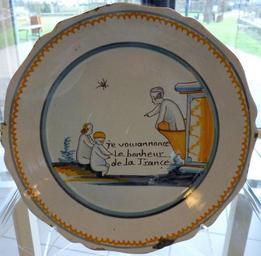 Keywords: Bonheur assiette.jpg Artwork Creator Anonymous en A person on the right adresses two chubby figures on the left The chubbyness is a sign for the end of the famine and for the hope of the people In the Ancien Régime the monarchy before the revolution it was custom that the priests were not only preaching but also bringing the news The figure on the right of this plate is a priest who brings the news je vous annonce le bonheur de la France 'I announce the general good of France to you' On February 23 1790 a new decree was enacted that ordered the priests to comment on the news from the National Assembly just like they did with the monarchy The news he announces here are a better world where the three Estates are united and nobody suffers from hunger 1793 faience Size cm 22 5 Institution Musée des Beaux-Arts de Bernay 1st floor cite web Assiette historiée http //collections musees-haute-normandie fr/collections/artitem/07010000238 Musées de Haute-Normandie 12 May 2013 object history exhibition history Was displayed when the photo was taken in the Centre Culturel Multimédia Bernay on the ground floor in the big room that's straight in front not the library part of the building credit line je vous annonce le bonheur de la France accession number own User Stanzilla Plates of the French Revolution Faience of Nevers on the French Revolution 1793 works in France Files by User Stanzilla Faience in the Musée des Beaux-Arts de Bernay Cc-zero |