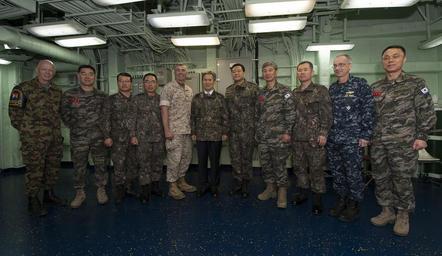 Keywords: Bonhomme Richard hosts ROK defense minister.jpg en Bonhomme Richard hosts ROK defense minister EAST CHINA SEA March 31 2014 Kim Kwan-jin the Republic of Korea's Minister of National Defense center and other distinguished visitors pause for a photo during a visit to the forward-deployed amphibious assault ship USS Bonhomme Richard LHD 6 The visit was part of exercise Ssang Yong an annual combined exercise conducted by Navy and Marine forces with the Republic of Korea in order to strengthen interoperability across the range of military operations Pictured are from left to right Swiss Army Maj Gen Urs Gerber Neutral Nations Supervisory Commission; Republic of Korea ROK Maj Gen Lee Sang-hoon Ministry of National Defense Inspector General for Defense Readiness; ROK Navy Rear Adm Chun Jung-soo ROK Navy Commander Flotilla Five; ROK Army Kim Yo-hwan 2nd Operational Command Commander; Lt Gen John Wissler III Marine Expeditionary Brigade; Minister Kim; Adm Hwang Ki-chul ROK Chief of Naval Operations; Lt Gen Lee Young-ju Commandant ROK Marine Corps; Gen Park Seon-woo Deputy Commander Combined Forces Command; Rear Adm Hugh Wetherald Commander Amphibious Force 7th Fleet; and Brig Gen Cho Kang-jae U S Navy photo by Mass Communication Specialist 2nd Class Adam D Wainwright/Released 2014-03-29 http //www cpf navy mil/news aspx/030368 and http //www flickr com/photos/compacflt/13541853664/ U S Navy photo by Mass Communication Specialist 2nd Class Adam D Wainwright PD-USGov-Military-Navy Ssang Yong 2014 Aboard USS Bonhomme Richard LHD-6 Urs Gerber Kim Yo-hwan John Wissler Kim Kwan-jin Lee Yeong-ju Hugh D Wetherald Neutral Nations Supervisory Commission Brassards Admirals of South Korea Generals of the Republic of Korea Marine Corps |