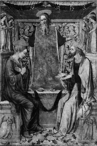 | Keywords: Bonifacio-bembo-cornation-christ-virgin-museo-civico-ala-ponzone-1467.jpg  en Oil on panel depiction of the coronation of Christ and the Virgin by God the Father from an altarpiece for the chapel of Sant'Agostino in Cremona The figures are also thought to represent Saints Daria and Grisante The altarpiece was commissioned by the Ducal family of Milan and commemorated the saints' feast day of October 25 which was also the anniversary of Francesco Sforza and Bianca Maria Visconti married in 1441 The panel currently resides in the Museo Civico Ala Ponzone in Cremona The Frick Collection http //images frick org/PORTAL/IMAGEINFO php file /Volumes/Photoarchive/Negatives/25774_25960/25856_POST tif Creator Bonifacio Bembo 1467 PD-old-100 <gallery>Bembo-cornation-christ-virgin-museo-civico-ala-ponzone-1467 jpg</gallery> 15th-century paintings of Coronation of Mary Bonifacio Bembo Sant'Agostino Cremona Altar paintings |
