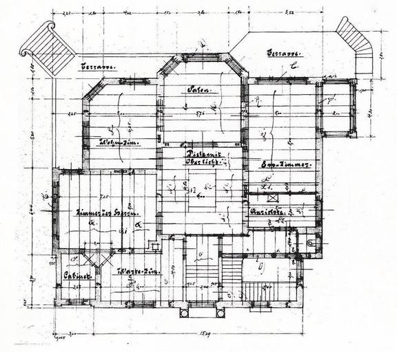 | Keywords: Bonn Villa Finkler erster Entwurf 1900 Grundriss Erdgeschoss.jpg Villa Finkler Tempelstraße 10 Bonn Erster Entwurf Zeichnung zum Bauantrag Grundriss des Erdgeschosses Olga Sonntag Villen am Bonner Rheinufer 1819 “1914 Bouvier Bonn 1998 ISBN 3-416-02618-7 Band 3 Katalog 2 S 160 1900 Westdeutsche Bau-Actien-Gesellschaft vormals Strecke und Söhne signature Strecke und ppa Scheidgen PD-old Tempelstraße 10 Bonn Floor plans of Germany | ||||