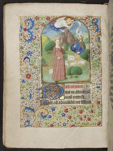 | Keywords: medieval renaissance illumination book of hours bookofhours annunciation to the shepherds annunciationtotheshepherds indoor photo border This Book of Hours was copied in Eastern France between 1425 and 1475. The miniature shown here is one of twelve large miniatures in gold frames, arched at the top and with three or four lines of text underneath. This leaf heralds the beginning of Terce for the Hours of the Virgin. It shows the Annunciation to the Shepherds, when the angel appeared to the shepherds to tell them of the birth of Jesus. The full border consists of a floral acanthus design. Immediately below the miniature is a 3-line initial in red and blue with white tracery on a gold ground. The Book of Hours was a medieval prayer book used by laymen for private devotion. These books were created for both men and women, but their place in female devotion is particularly noteworthy. The text centres on the Hours of the Virgin, a series of prayers to be said at the eight canonical hours of Matins, Lauds, Prime, Terce, Sext, None, Vespers, and Compline. This Book of Hours was copied in Eastern France between 1425 and 1475. The miniature shown here is one of twelve large miniatures in gold frames, arched at the top and with three or four lines of text underneath. This leaf heralds the beginning of Terce for the Hours of the Virgin. It shows the Annunciation to the Shepherds, when the angel appeared to the shepherds to tell them of the birth of Jesus. The full border consists of a floral acanthus design. Immediately below the miniature is a 3-line initial in red and blue with white tracery on a gold ground. The Book of Hours was a medieval prayer book used by laymen for private devotion. These books were created for both men and women, but their place in female devotion is particularly noteworthy. The text centres on the Hours of the Virgin, a series of prayers to be said at the eight canonical hours of Matins, Lauds, Prime, Terce, Sext, None, Vespers, and Compline. |
