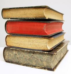 Keywords: books book section paper pages book cover bound red old used worn antiquarian read used books spine library