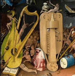 | Keywords: Bosch, Hieronymus - The Garden of Earthly Delights, right panel - Detail musical instruments (left).jpg Artwork The Garden of Earthly Delights right panel Detail Musical instruments left oil panel institution Museo del Prado 70px Google Earth Ultra High Resolution photos of the Museo Nacional del Prado<sup><small> http //www museodelprado es/en/the-collection/sueltas/masterpieces-of-the-prado-museum-with-google-earth/ How-To </small></sup> Creator Hieronymus Bosch Other versions <gallery>File El jardÃn de las Delicias detalle Hieronymus Bosch 1500 png</gallery> PD-old-100-1923 The Garden of Earthly Delights right panel Musical instruments Left Still-life paintings of musical instruments Details of paintings from Prado in Google Earth Details of The Garden of Earthly Delights Group paintings of nude males torture in art 4 3 Uploads by Mattes from external sources Harps in art Musical notes in art Lyres in art Pointing in art Monsters in art ImageNote 1 497 1553 234 194 1944 1971 2 pointing ImageNoteEnd 1 |
