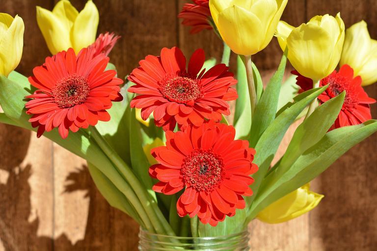 Keywords: bouquet tulips gerbera cut flowers spring flowers yellow flowers red flowers close flowers