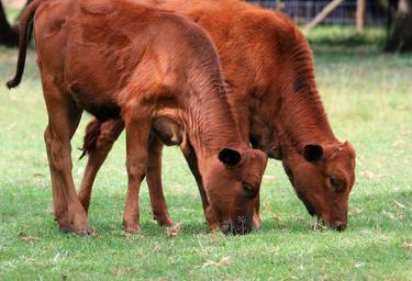Keywords: bovine calves grazing red brown grass meadow eating farm